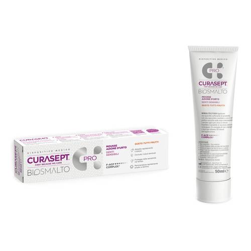 Curasept Biosmalto Descrizione Mousse azione d'urto domiciliare. Contiene 1450 ppm F-. Gusto tutti frutti. Indicata per il proseguimento del trattamento professionale effettuato in studio. Ideale per la prevenzione e trattamento delle lesioni smalto-dentinali nei pazienti con una elevata sensibilità, sempre associata ad un dentifricio della linea denti sensibili. Formato Flacone da 50 ml. Cod. CS02363